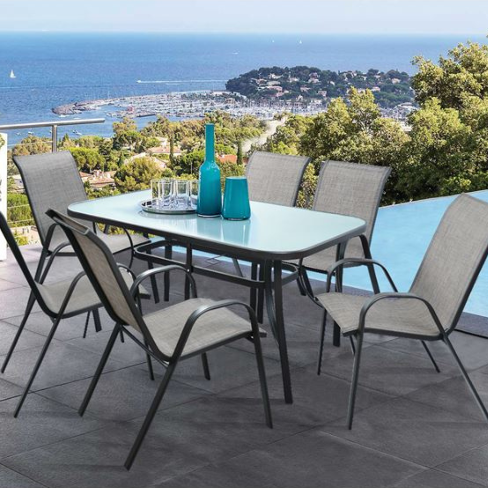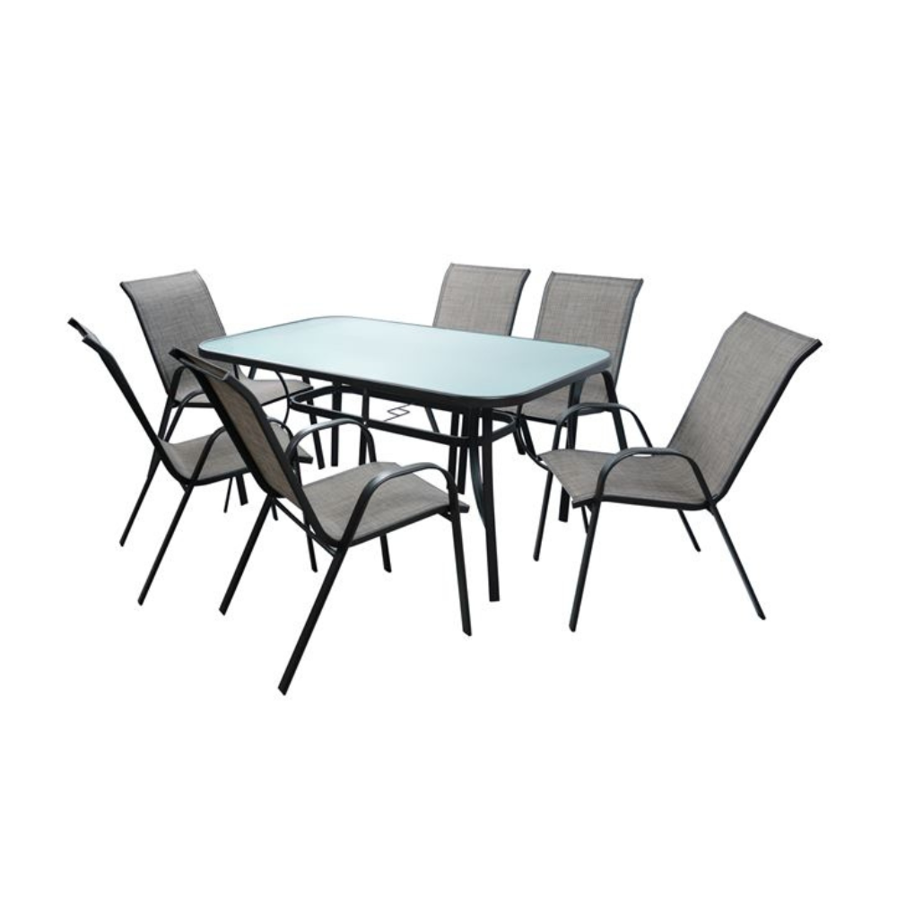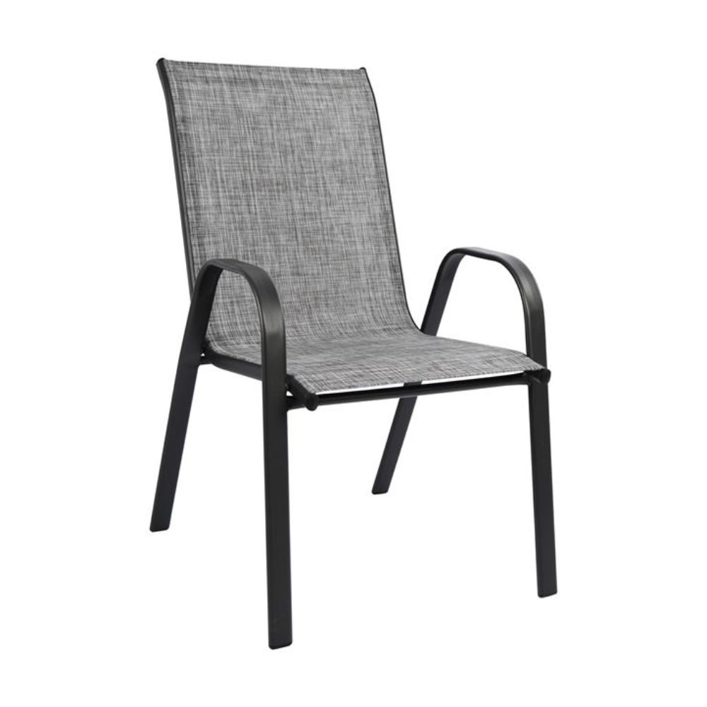 Έξι πολυθρόνες εξωτερικού χώρου από μεταλλικό σκελετό σε γκρι χρώμα με textilene 2×1 μεγάλης αντοχής σε ήλιο και βροχή.