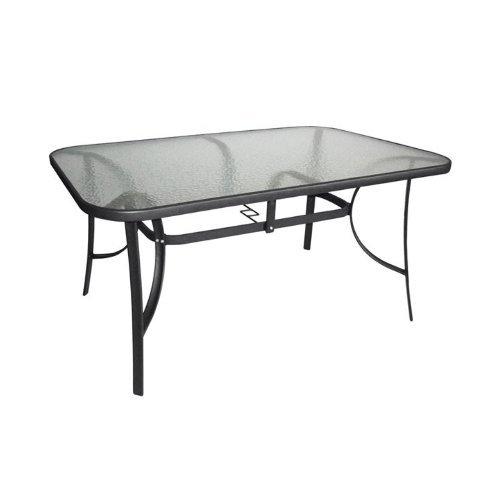 Ένα τραπέζι μεταλλικό εξωτερικού χώρου σε χρώμα γκρι-ανθρακί, με ενσωματωμένο τζάμι ασφάλειας (secure).