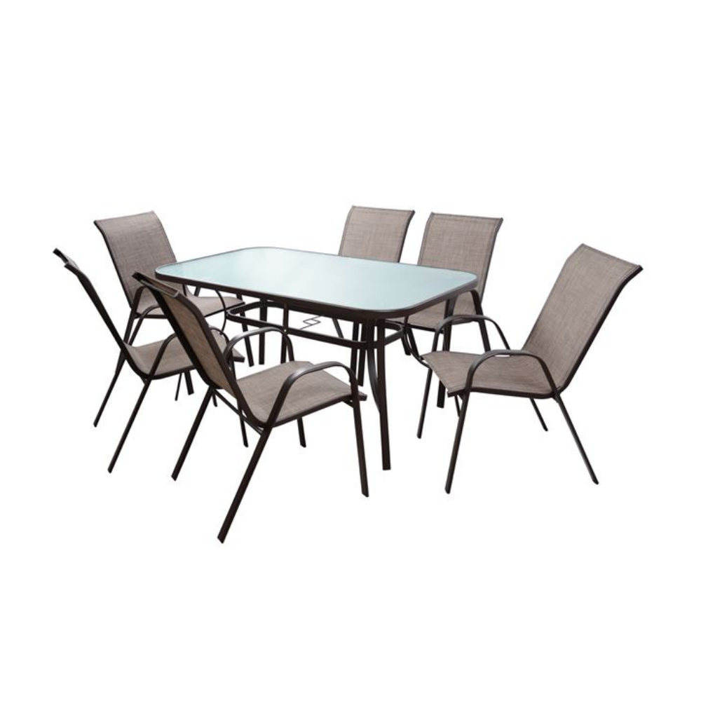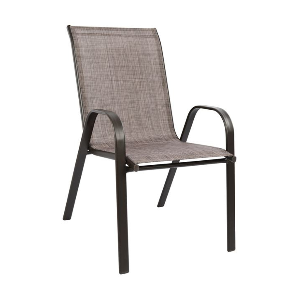 Έξι πολυθρόνες εξωτερικού χώρου από μεταλλικό σκελετό σε καφέ χρώμα με textilene 2×1 μεγάλης αντοχής σε ήλιο και βροχή.