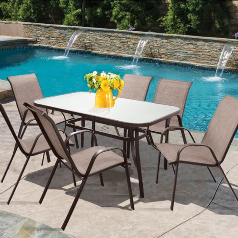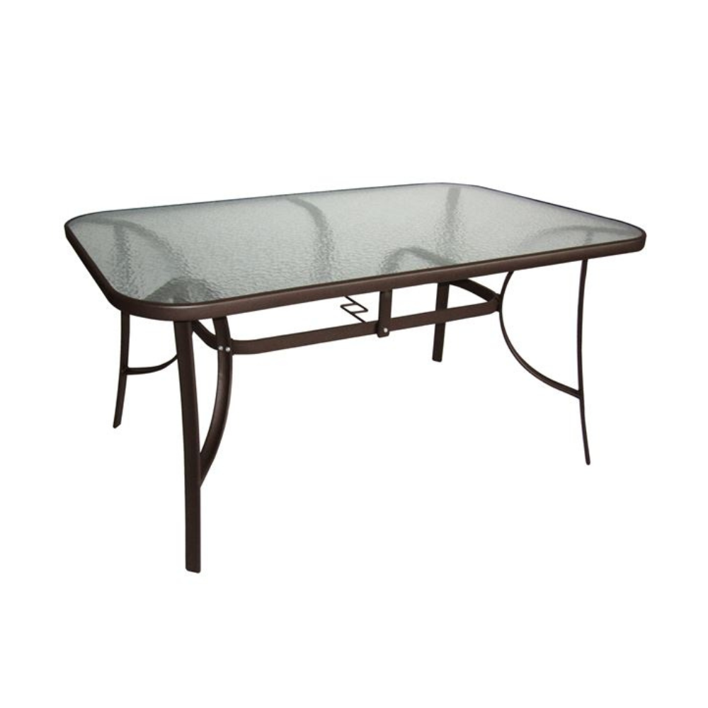 Ένα τραπέζι μεταλλικό εξωτερικού χώρου σε χρώμα καφέ, με ενσωματωμένο τζάμι ασφάλειας (secure).