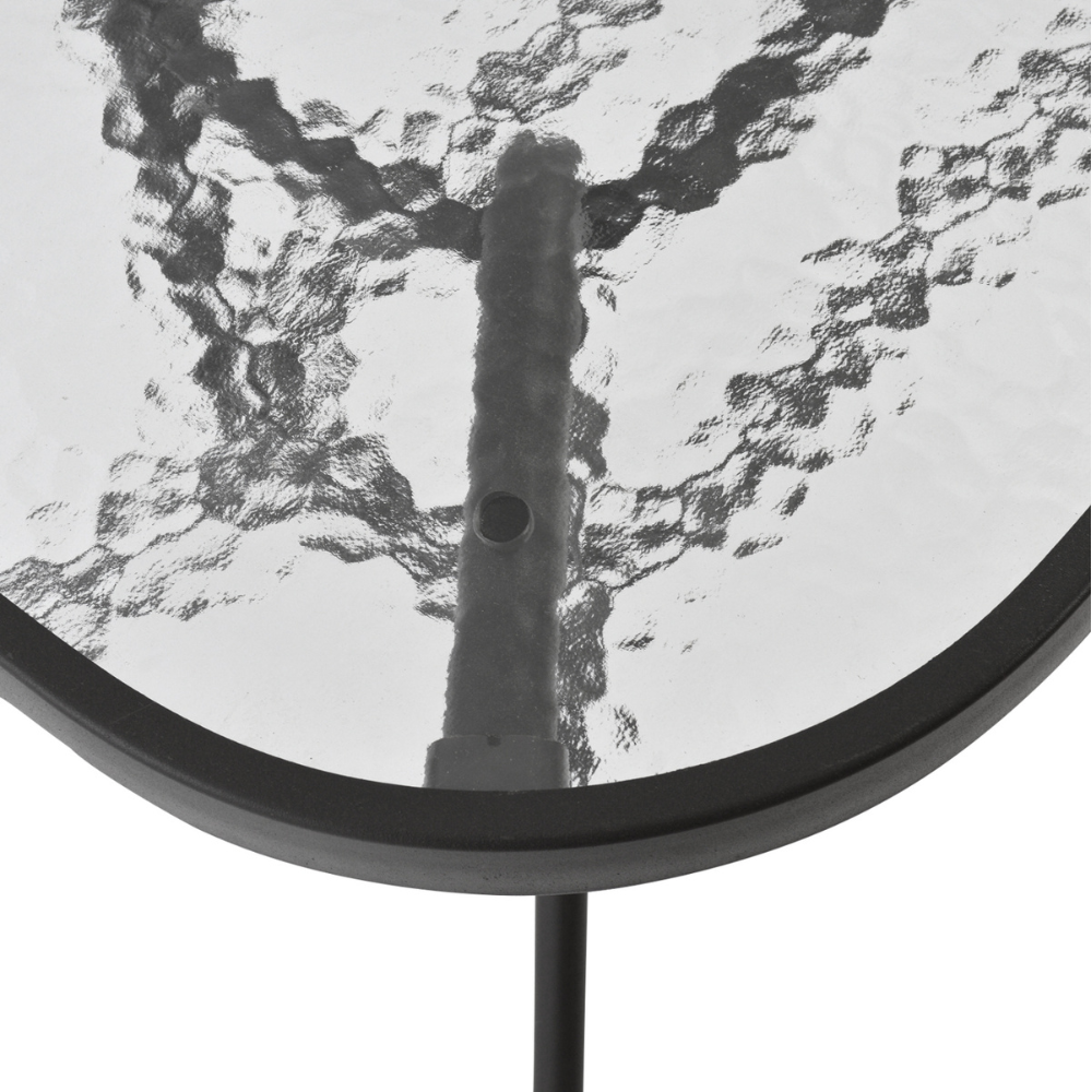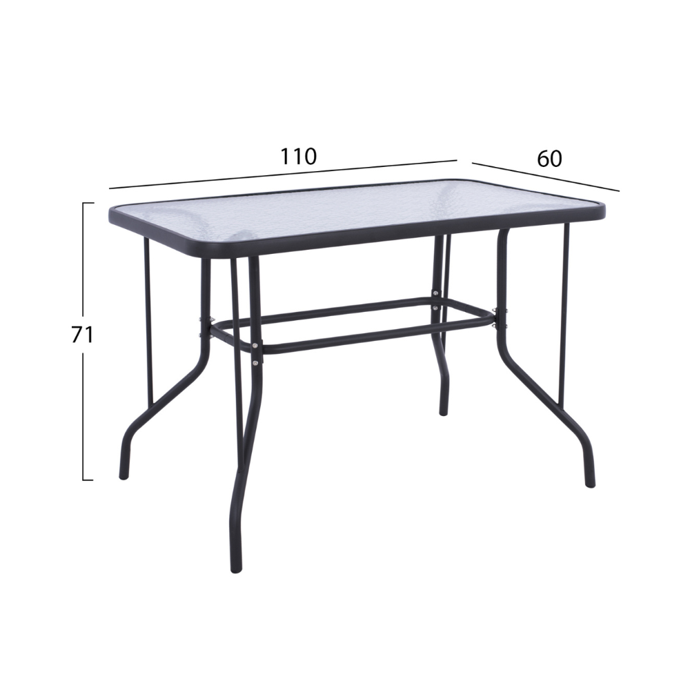 Ένα τραπέζι μεταλλικό εξωτερικού χώρου σε χρώμα γκρι-ανθρακί, με ενσωματωμένο τζάμι ασφαλείας (secure).