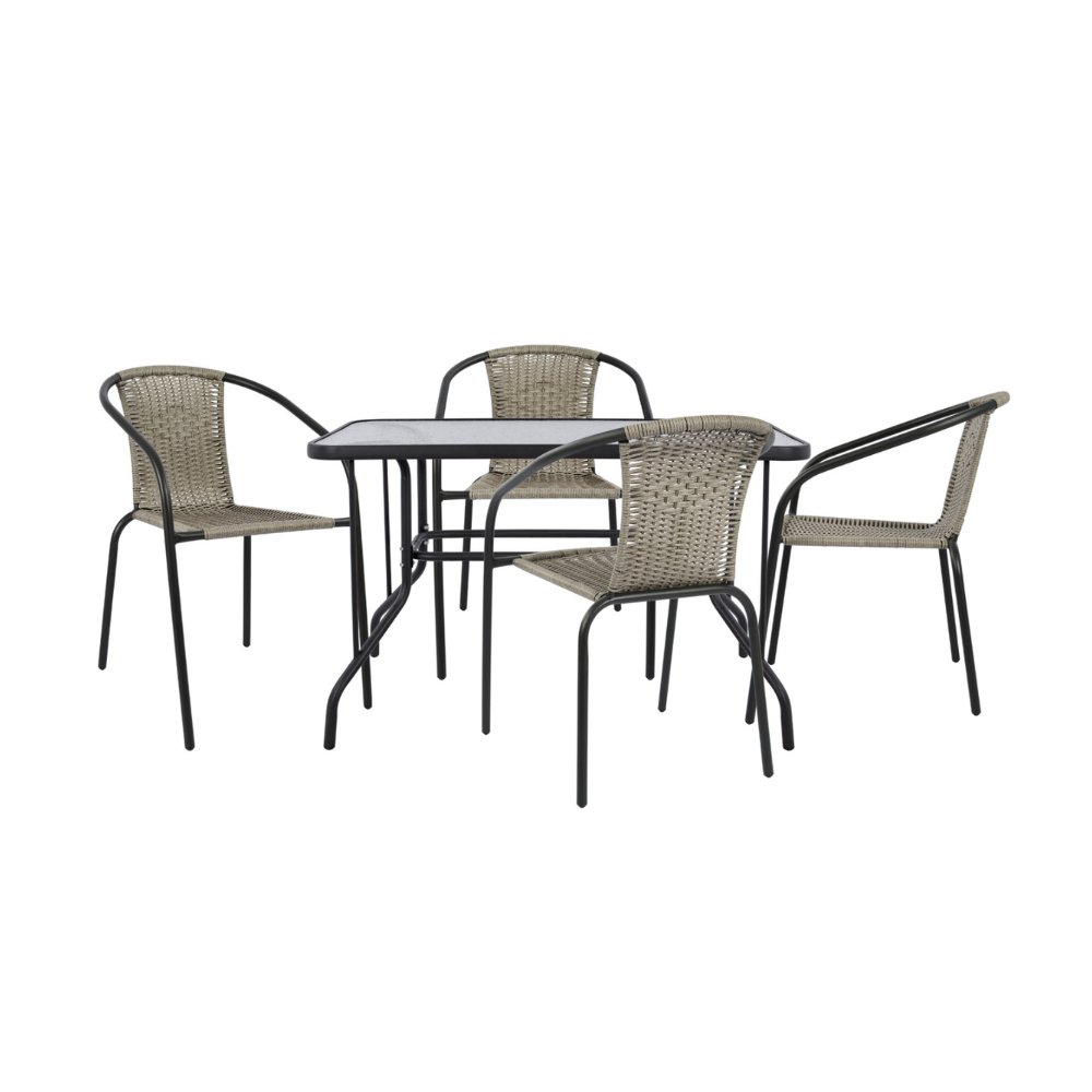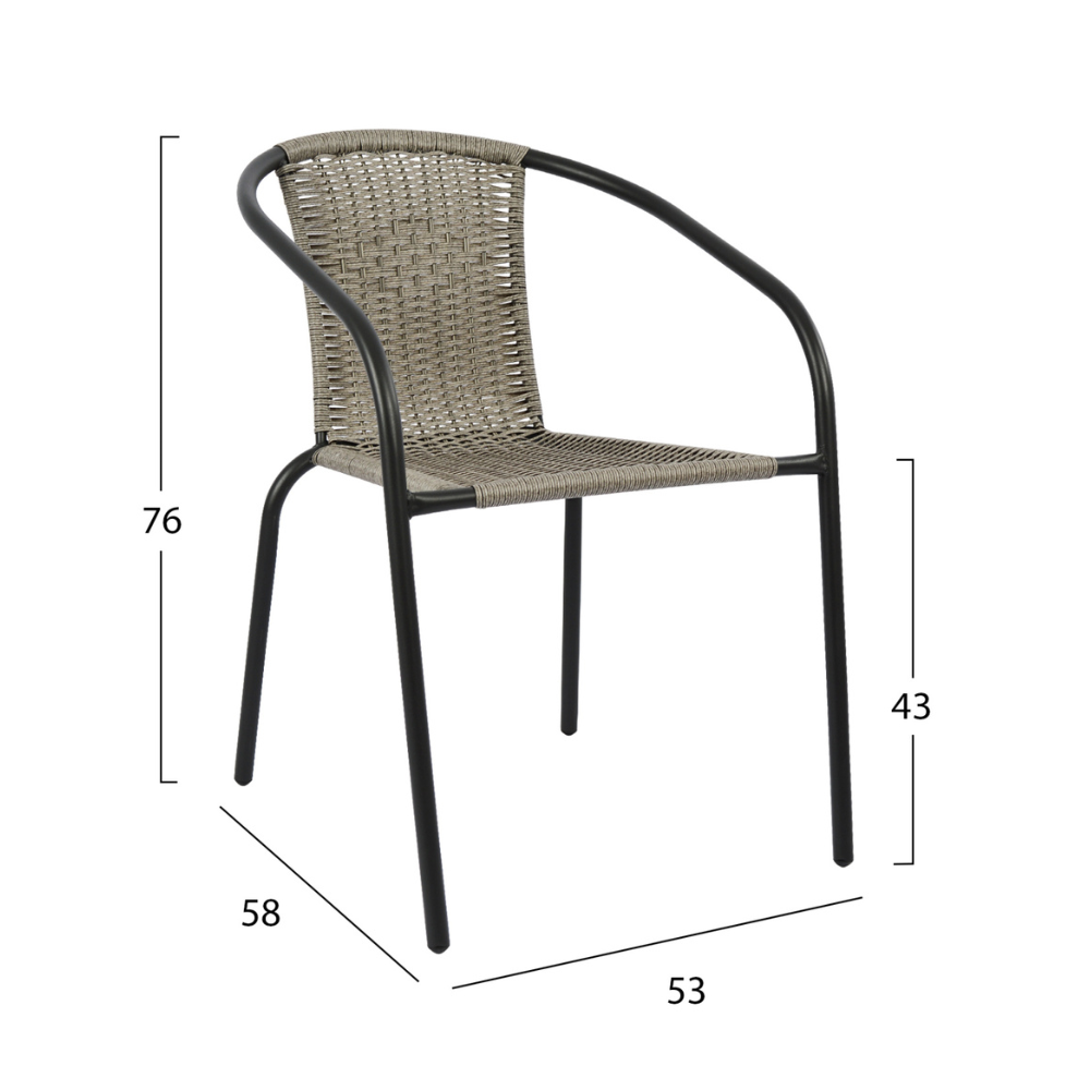 Η πλάτη και το κάθισμα είναι ντυμένα με πλεκτό συνθετικό υλικό wicker σε ανοιχτό γκρι χρώμα.