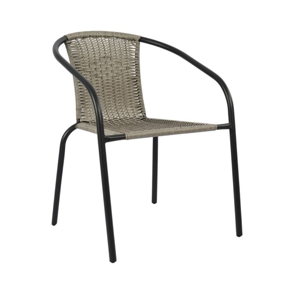 Η πλάτη και το κάθισμα είναι ντυμένα με πλεκτό συνθετικό υλικό wicker σε ανοιχτό γκρι χρώμα.