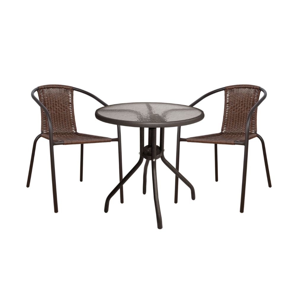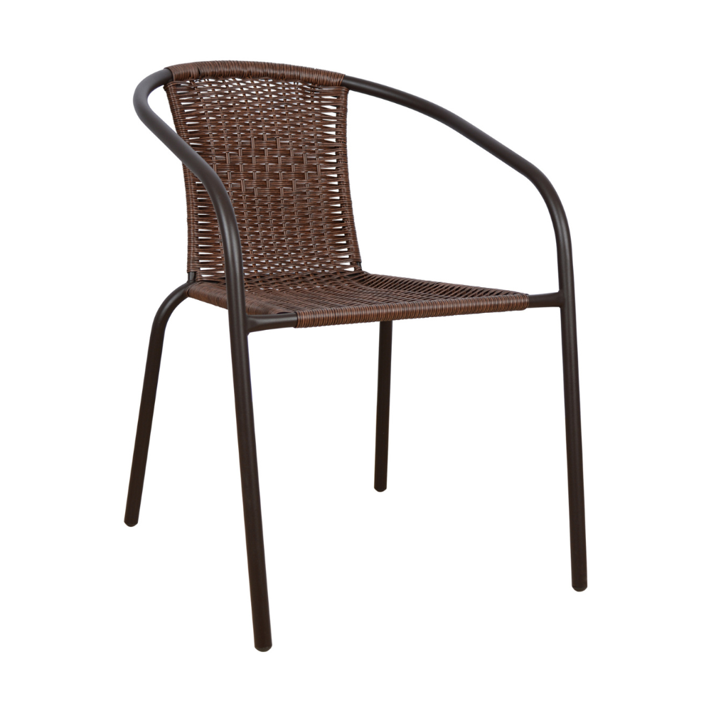 Η πλάτη και το κάθισμα είναι ντυμένα με πλεκτό συνθετικό υλικό wicker σε καφέ σκούρο χρώμα.