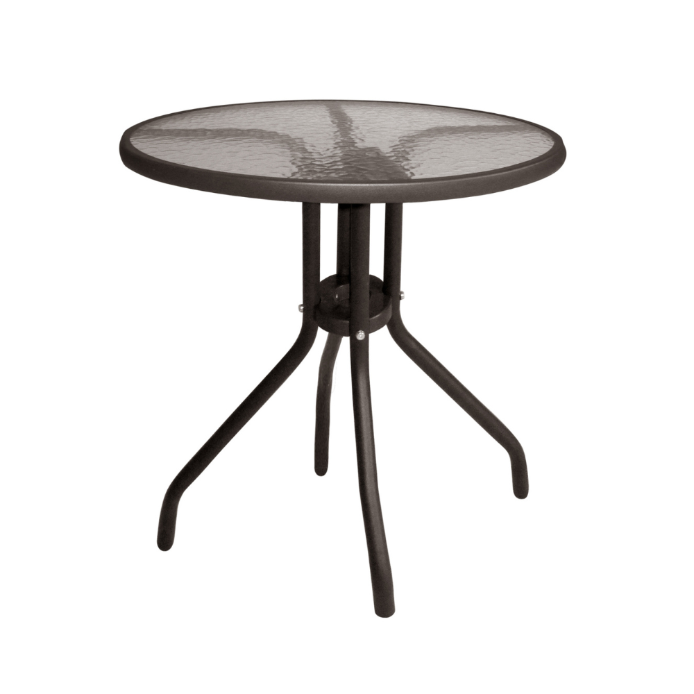 Ένα τραπέζι μεταλλικό εξωτερικού χώρου σε χρώμα καφέ , με ενσωματωμένο τζαμί ασφάλειας (secure).
