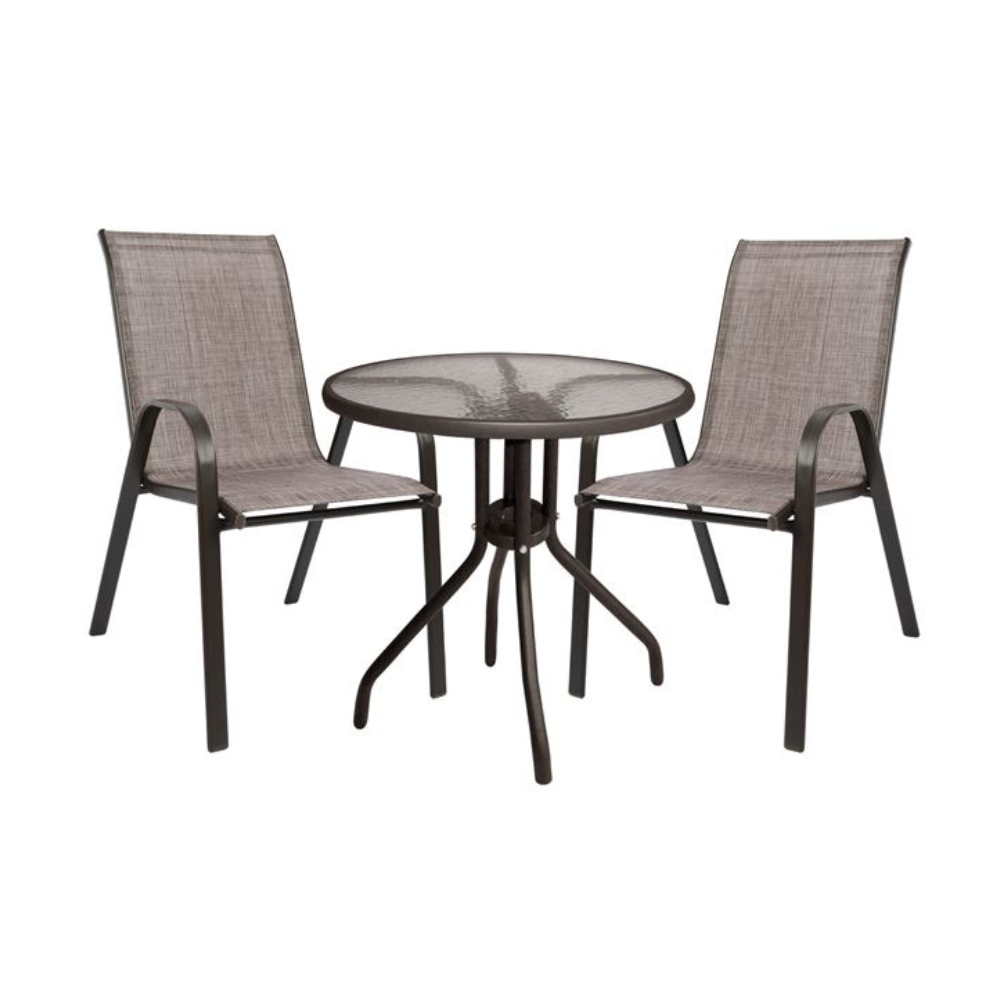 Δύο πολυθρόνες εξωτερικού χώρου από μεταλλικό σκελετό σε καφέ χρώμα με textilene 2×1 μεγάλης αντοχής σε ήλιο και βροχή.