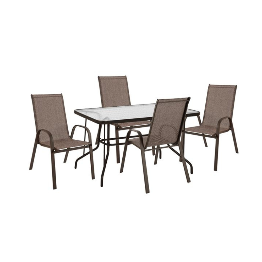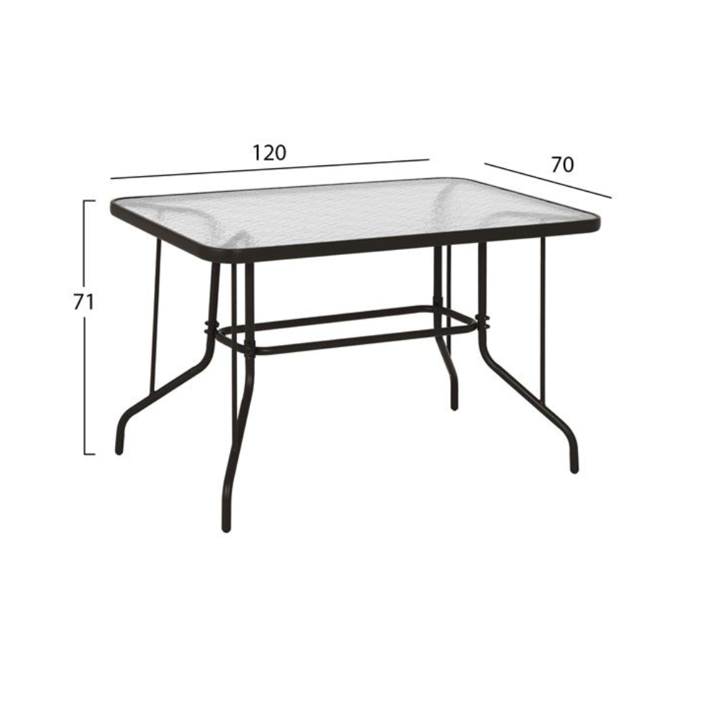 Ένα τραπέζι μεταλλικό εξωτερικού χώρου σε χρώμα καφέ, με ενσωματωμένο γυαλί ασφαλείας (tempered).