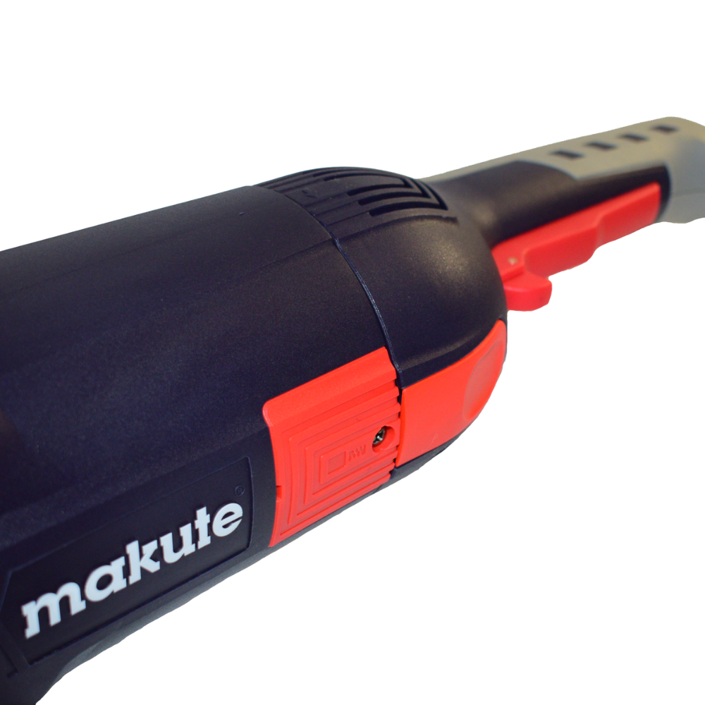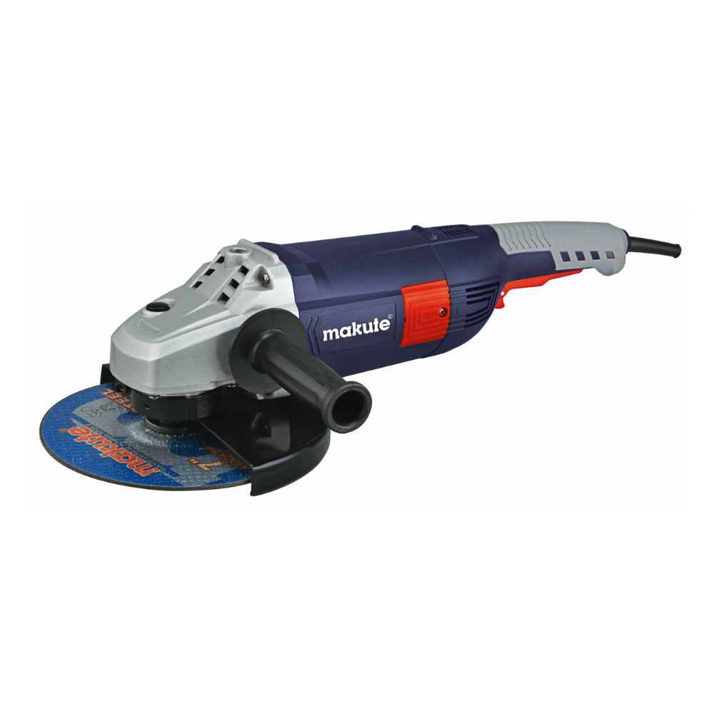 Κόμπακτ ισχυρός γωνιακός τροχός 2400W, MAKUTE. Η συσκευασία περιλαμβάνει κλειδί, πλευρική βοηθητική λαβή, παξιμάδι ασφαλείας, προστατευτικό τροχίσματος.